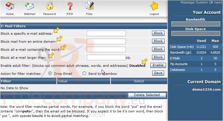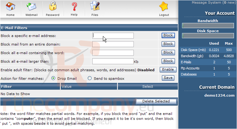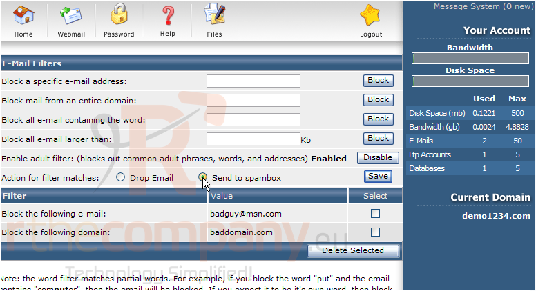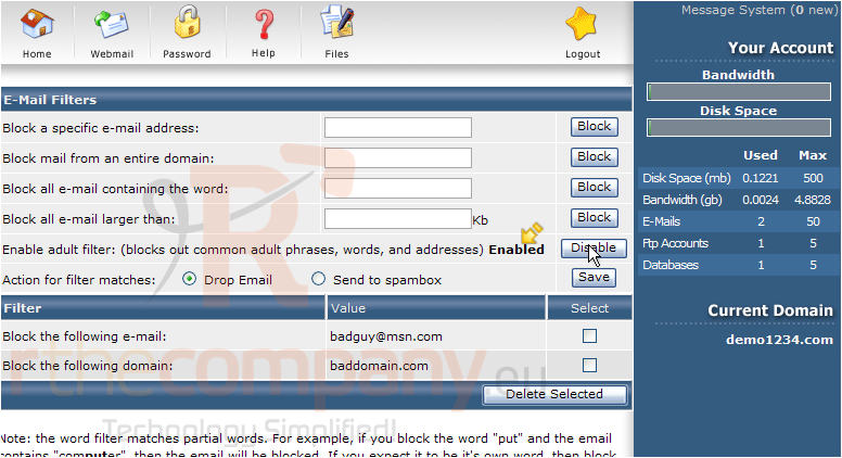 This is the main E-mail Filter (or spam filter) screen, where you can enter several different kinds of filters. You can block email from specific email addresses, from an entire domain, or emails containing specific words. You can also block emails that are too large, and/or enable the adult email filter which will block emails containing common adult phrases